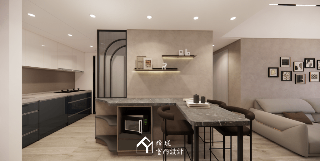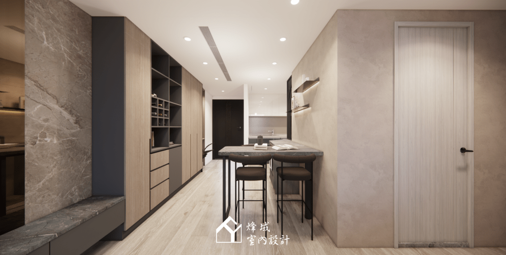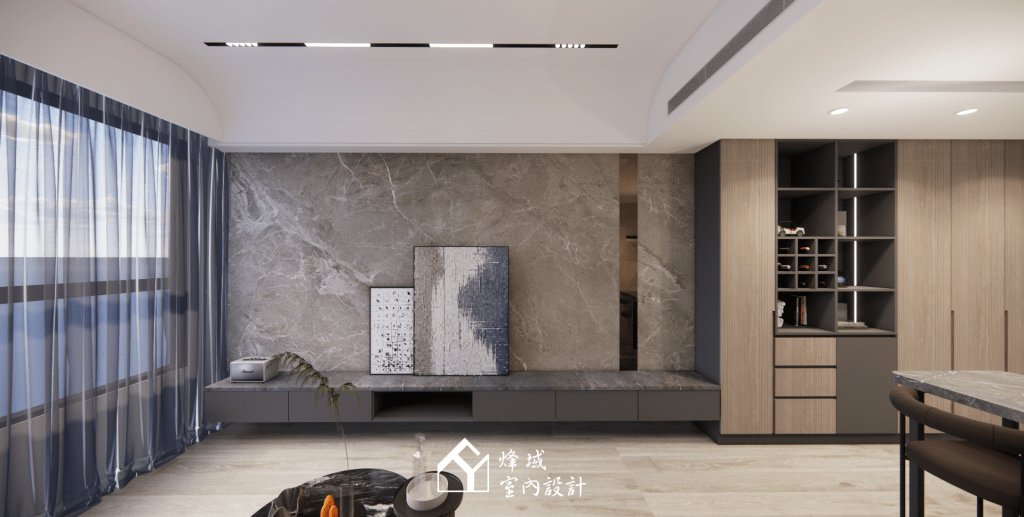 客廳區域以視覺開闊的石紋大理石背牆為焦點,透過懸空電視櫃與牆面的異材質分割,消弭了櫃體的沉重感,營造出輕盈的立面美學。我們在天花板與櫃體邊緣巧妙嵌入間接光源,光影流轉於石材紋理之間,讓白晝與黑夜展現截然不同的層次張力。開放式的客餐廳動線,結合石紋地坪與簡約餐桌區,勾勒出流暢且具飯店感的生活範式。
