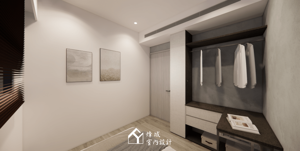 主臥室的設計回歸純粹的放鬆機能。床頭背牆選用布面質感搭配金屬飾條,與溫潤的木質屏風相互呼應,營造出包覆感十足的入眠氣氛。次臥則展現了強大的系統規劃實力,將書桌、衣櫃與床頭收納一體化整合,在有限的坪數內極致化每一吋使用空間,卻依然維持視覺上的簡約俐落。